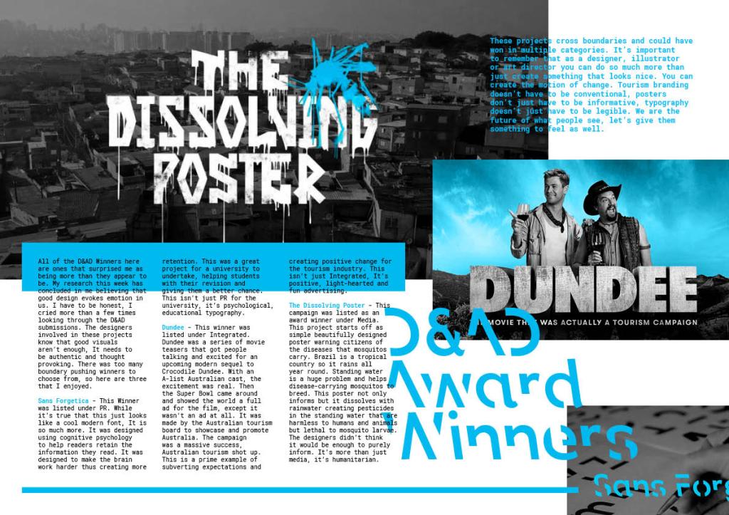 Conclusion – These projects cross boundaries and could have won in multiple categories. It’s important to remember that as a designer, illustrator or art director you can do so much more than just create something that looks nice. You can create the motion of change. Tourism branding doesn’t have to be conventional, posters don’t just have to be informative, typography doesn’t just have to be legible. We are the future of what people see, let’s give them something to feel as well.