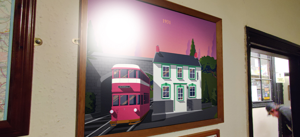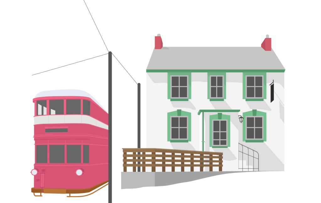 I knew that I wanted to bring various elements together to create an Illustrated piece to showcase a time gone by. There isn’t an image of a train/tram going by The Railway Inn. Below are the biggest references I used. I also took inspiration from some of the images captured inside the pub. There is a painting from 1999 that shows a bottom layer of stonework that is no longer part of the building. It also gave me some great clues as to the colour of the accents on the building. I took a little creative liberties when It came to the placement of the Tram, it was never that close to the building.