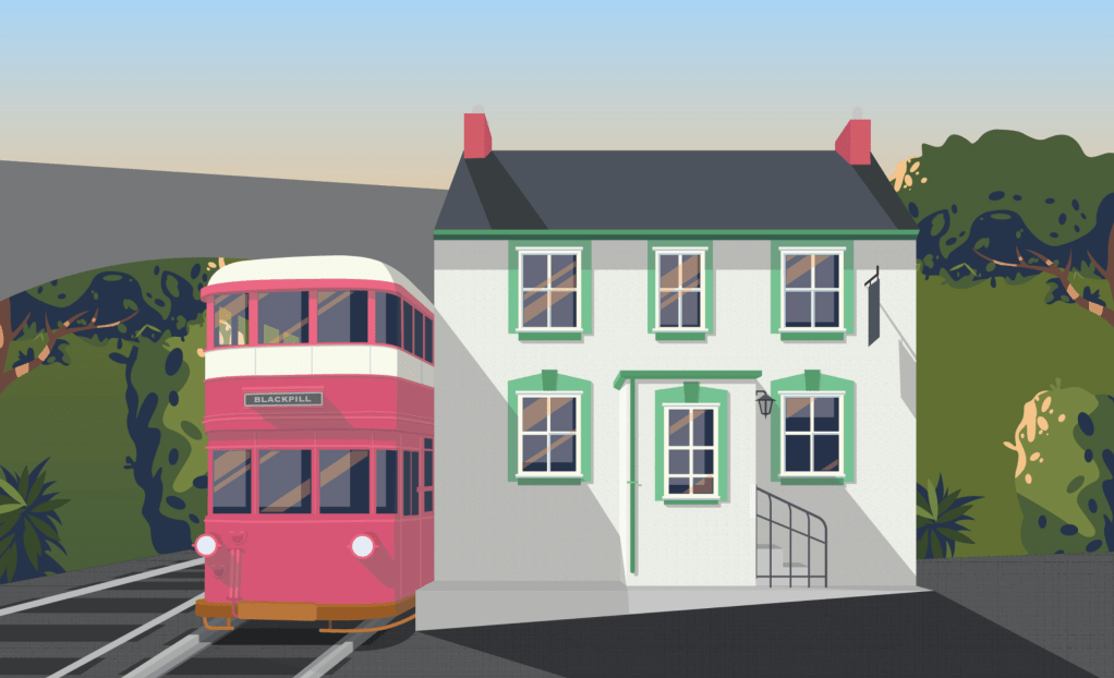 I decided to highlight the fact that this railway was a passenger line by adding a tram into the composition. Trams were used all throughout Swansea in the early 1900s and the city was famous for it. The bright red double decker trams would carry passengers around the bay. I’m lucky enough to have my Grandmother around who could tell me her memories of using the tram as a child. She said “they were marvellous and futuristic, albeit slow and cumbersome”.
