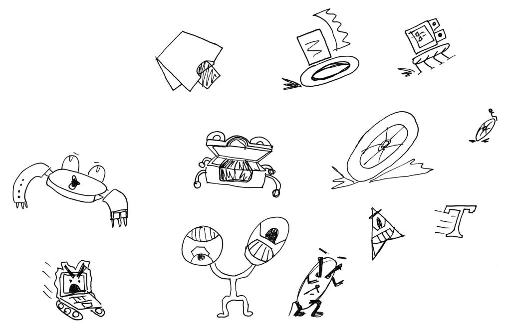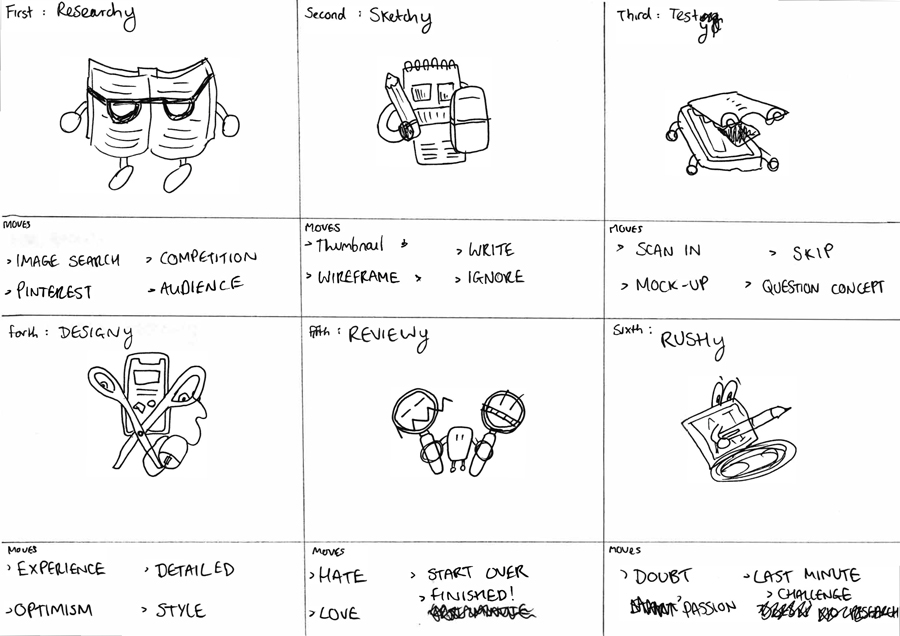 Researchy, Sketchy, Testy, Designy, Reviewy and Rushy. (The ‘y’ was ditched pretty quickly for simplicity, and because they sound stupid). I gave each of these little fellas a set of 4 moves that they can utilise in battle against the evil briefs. I wasn’t 100% happy with the initial look of these ‘STEPS’ so I came up with more, perhaps too many… It was super fun. Took me back to my childhood of actually playing these games.