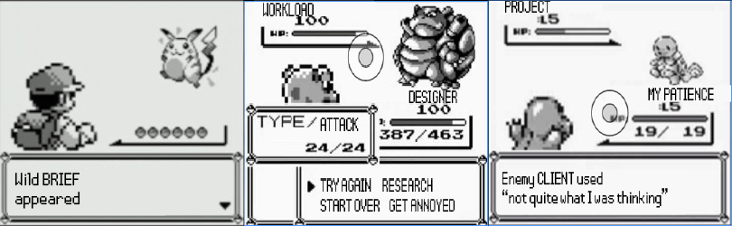 As my skills and gaps are all a part of me, I decided to go for a ‘Pokemon’ team style aesthetic. A brief/client is considered an enemy and my skills are my ‘Pokemon’ that I use to combat the brief. I first messed around with standard Pokemon screens and edited the text to fit my outcome.